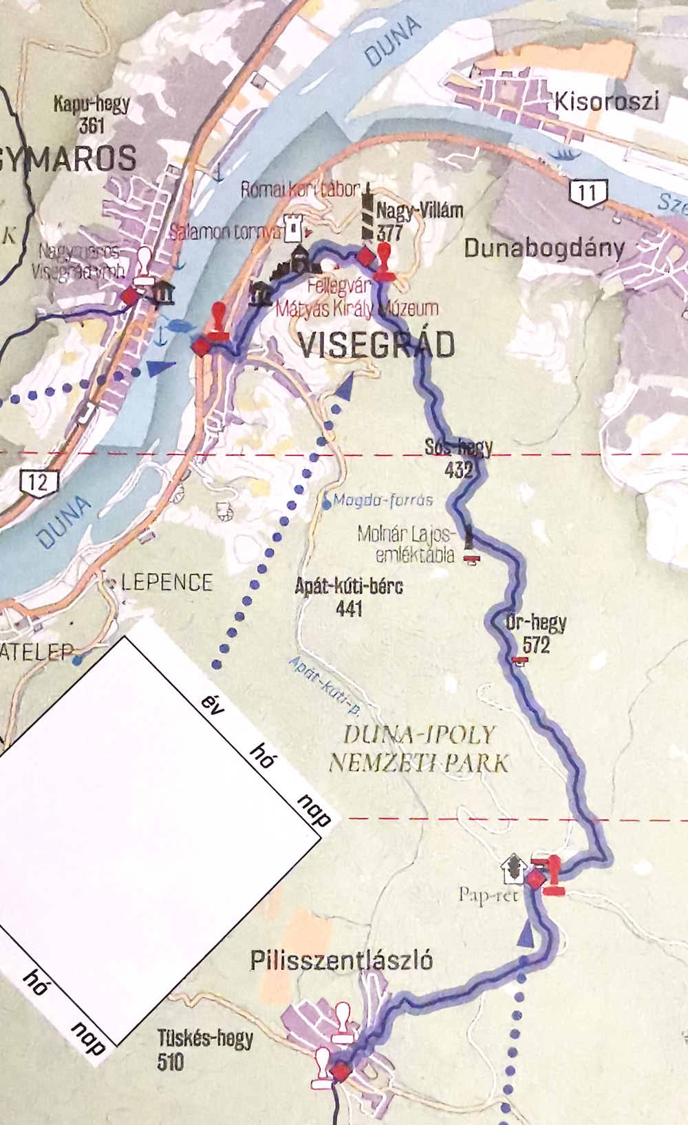 2020. október 11-én, vasárnap reggel egy e-mailben küldött időpontban Visegrádon találkozunk. Visegrádtól először 2,5 km-t gyalogolva a Nagy-Villám (377 m) tetején lévő kilátóba megyünk fel. Panoráma a fennséges Dunakanyarra. Innen a Sós-hegyen (432 m) és az Őr-hegyen (572 m) át a Pap-réti erdészháznál szerezzük be harmadik pecsétünket. Pap-rétről csak 3 km és elérünk kellemes vasárnapi túránk végére, Pilisszentlászlóra. Itt van tömegközlekedési lehetőség Szentendre irányába.